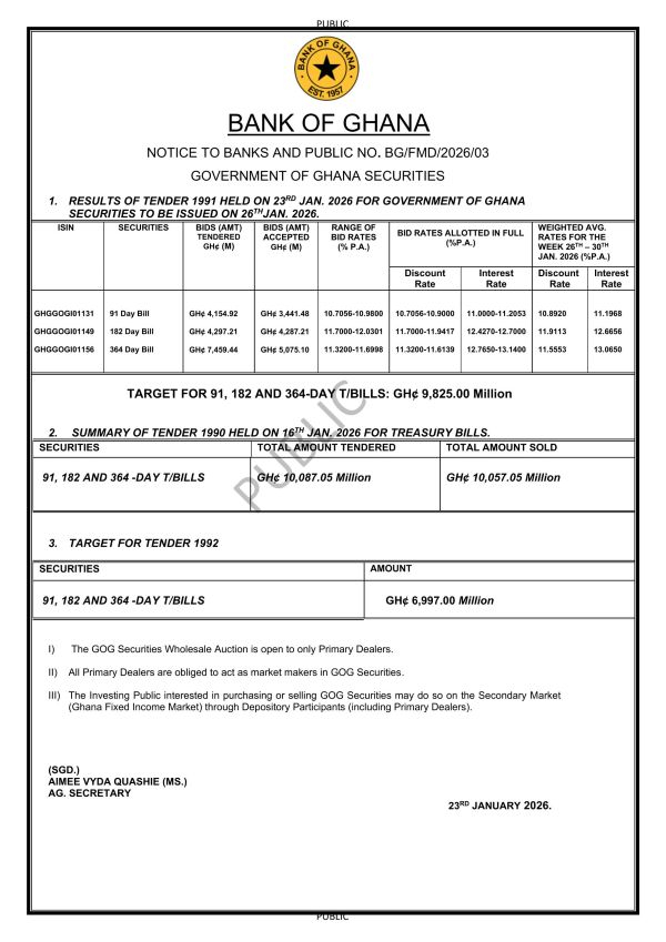 The Bank of Ghana recorded a 30.31 percent oversubscription in its latest treasury bill auction on January 23, 2026, marking the eighth consecutive oversubscription of treasury bills.