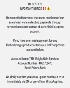 She had to post a notice on her Instagram to alert her customer of the fraud, and directed them to the legitimate business account.