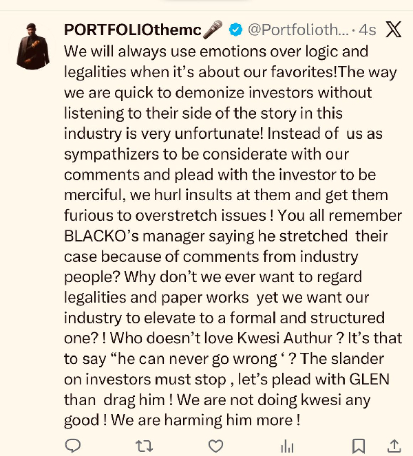Popular entertainment commentator MC Portfolio has called on fans and industry stakeholders to moderate their emotions in the unfolding dispute between Ghanaian rapper Kwesi Arthur and his former label, Ground Up Chale.