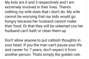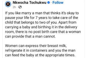 “If you like marry a man that thinks it’s okay to pause your life for 7 years to take care of the child that belongs to two of you. Apart from carrying a baby and birthing it in the delivery room, there is no post birth care that a woman can provide that a man cannot.
