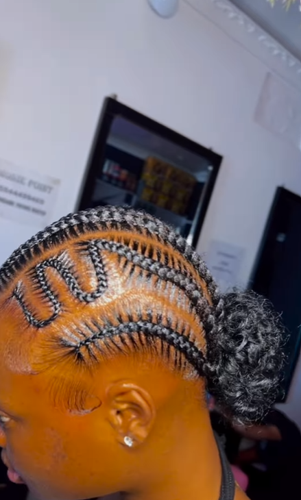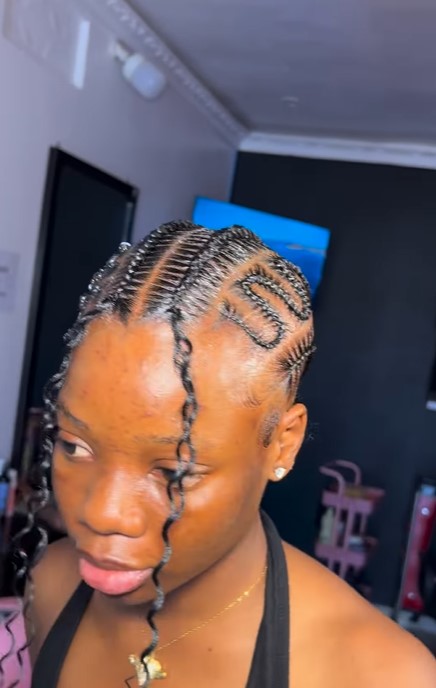 The lady displays her intricate hairstyle confidently in the video posted online. The intricate hairdo, including zigzag, stitch braids, and interlaced knots, seemed divided into many cornrows.