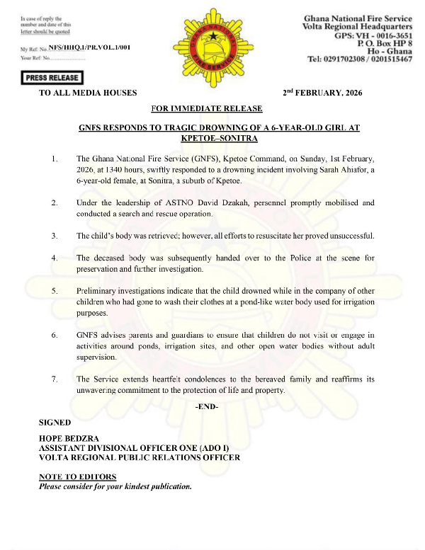 “GNFS advises parents and guardians to ensure that children do not visit or engage in activities around ponds, irrigation sites, and other open water bodies without adult supervision,” it advised.