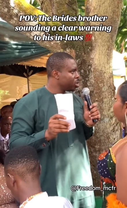 The bride’s brother was seen in the widely shared video asking for the family’s attention while holding out the white envelope containing the bride’s payment.