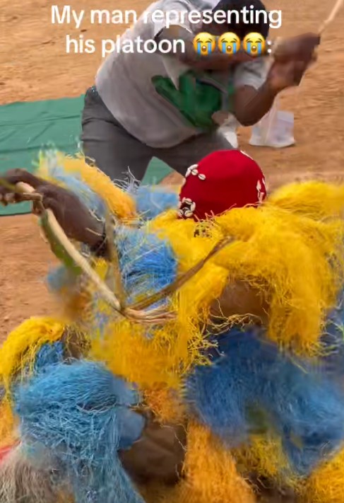 In a later clip, she revealed a video of her boyfriend performing as a masquerade on the floor while being thrashed by an unidentified individual, to represent a deity and entertain the audience.