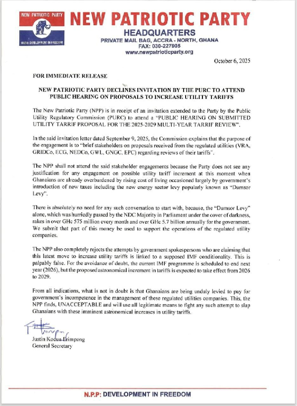 The New Patriotic Party (NPP) has declined an invitation from the Public Utilities Regulatory Commission (PURC) to attend a public hearing on proposed utility tariff increases for the 2025–2029 period, describing the discussions as “unwarranted” and “insensitive” given the current economic hardship facing Ghanaians.