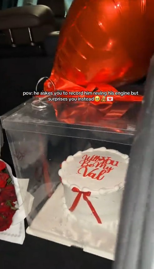 According to her, she thought he wanted to show off the vehicle’s sound, so she held up her phone and began recording as requested. However, seconds later, the situation took a surprising turn when the car booth opened, and she discovered a “Will you be my Valentine” package comprising a mini teddy bear, a bouquet, and a customized cake.