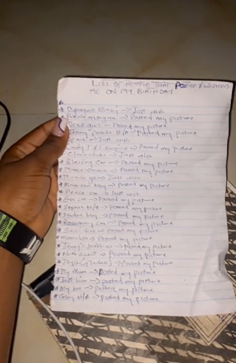 On the front and back of a sheet of paper with the header, “List of people that posted and wished me on my birthday,” the lady recorded the names of her well-wishers, as seen in the video.